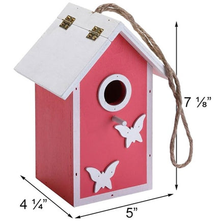 Invite songbirds to your garden with this adorable pink birdhouse featuring butterfly details and a white roof. The 1-inch entrance welcomes small birds while keeping larger visitors out. Hinged roof design makes cleaning simple, and the fabric loop hangs easily anywhere. Built from sustainable wood for lasting durability season after season.