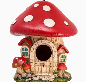 This decorative birdhouse is a lovely way to brighten up your indoor or outdoor space! It is made of durable hand painted resin and measures over 8" high.