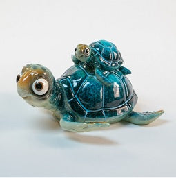 Bright blue resin This 7" blue turtle with baby figurine is crafted with a cartoon-style Big-Eyes to create a fun, eye-catching decorative piece. The figurine's detailed eyes bring it to life with its own unique personality, making it the perfect addition to any home.
