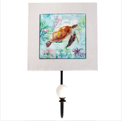Wall Hanging Wooden Frame with Inset Decorative Ceramic Tile and Large Metal Hook with Ceramic Ball – Sea Turtle Design on the Tile, So You Could Say This is Pretty Practical