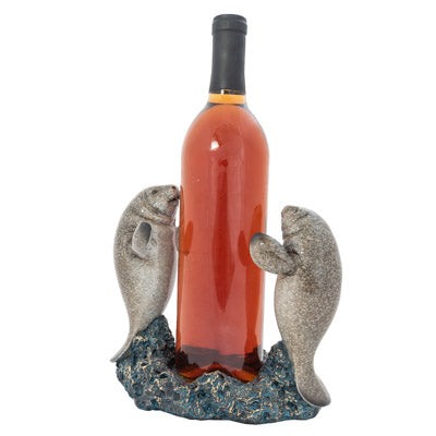 This charming bottle holder features a pair of playful manatees, gracefully emerging from the ocean to hold your favorite wine. It's the perfect nautical decoration or gift, adding both functionality and whimsy to any space.